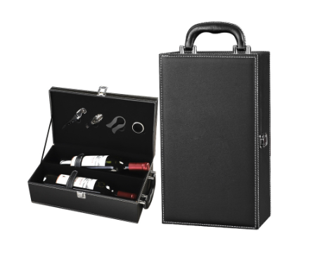 Set quà tặng gồm hộp đựng 2 chai rượu vang, bộ dụng cụ mở rượu.