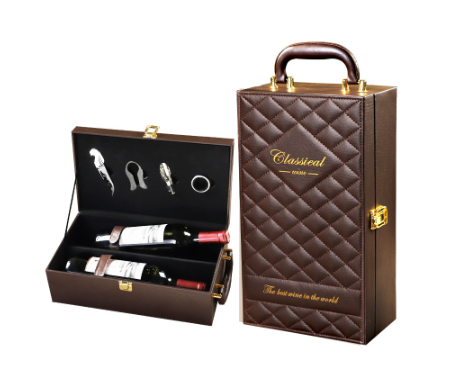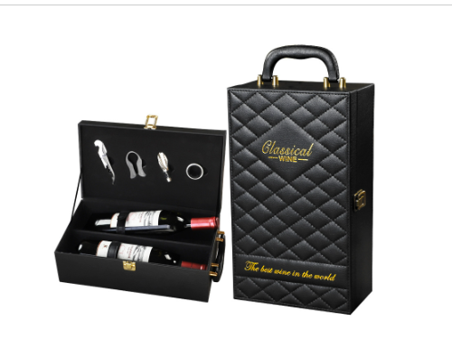 Set quà tặng gồm hộp đựng 2 chai rượu vang, bộ dụng cụ mở rượu.